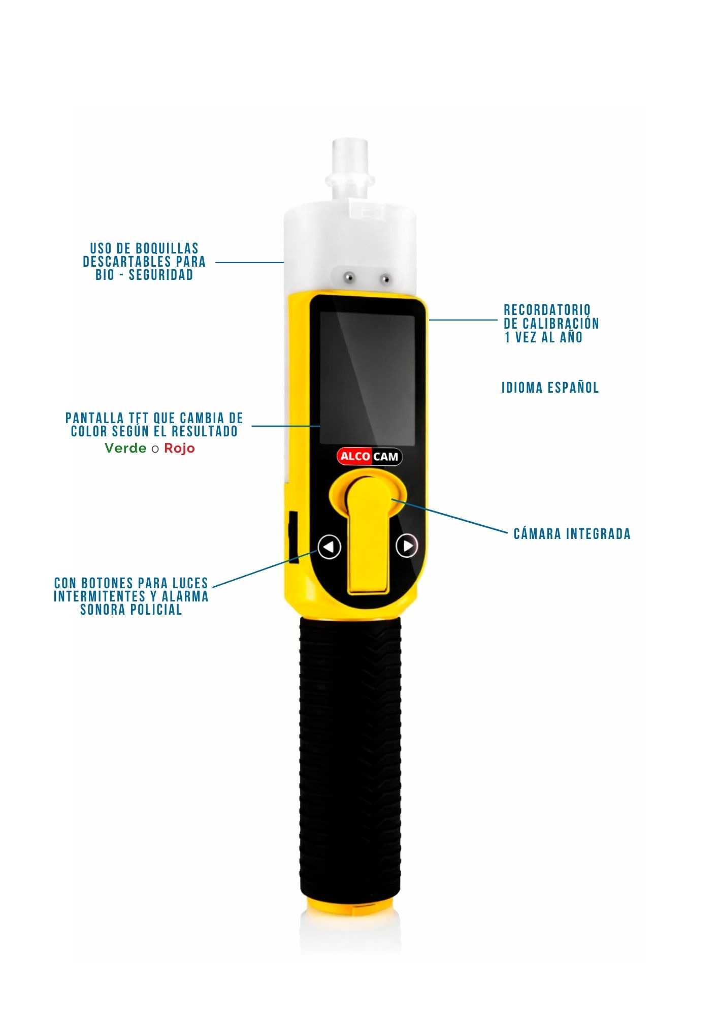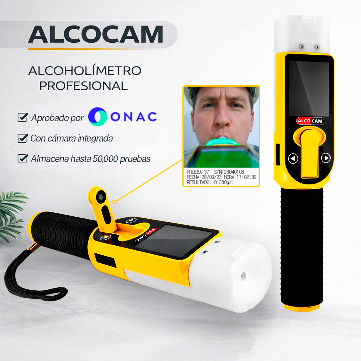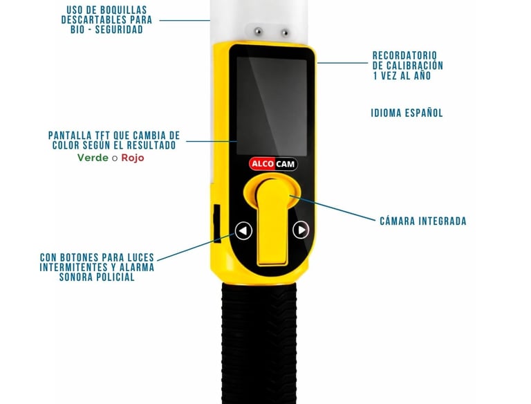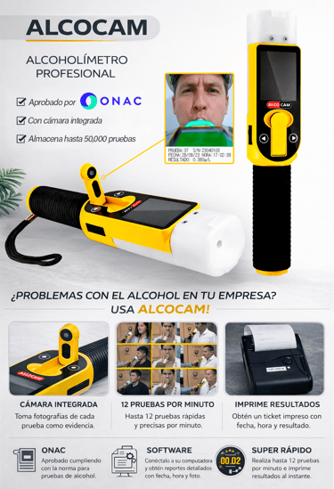 El Alcoholímetro Alcocam un equipo profesional que permite la detección precisa de alcohol en el aliento de una persona, incorpora una cámara que captura la fotografía del evaluado al momento de las pruebas en sus 3 modos de uso: Evidencial, Activo y Pasivo. Por su diseño, modo de empleo y facilidad de uso, el Alcocam es el equipo ideal para realizar grandes cantidades de pruebas y así prevenir y buscar disminuir los riesgos de accidentes.