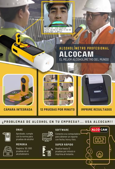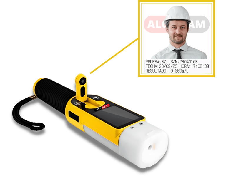 El alcoholímetro Alcocam es un equipo profesional diseñado para la detección precisa de alcohol en el aliento. Incorpora una cámara integrada que captura la fotografía del evaluado en cada medición, garantizando trazabilidad, control y evidencia confiable del proceso.