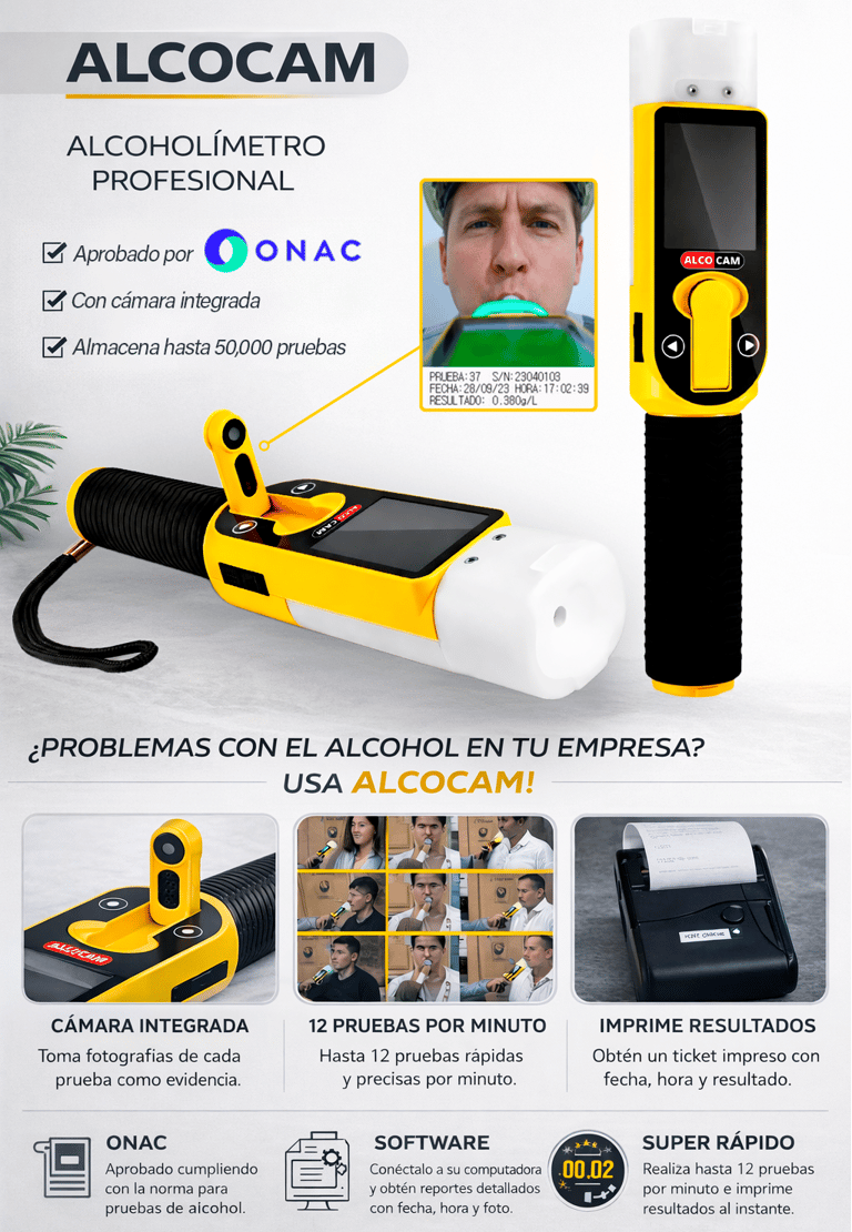 Ideal para empresas que requieren control de alcohol preventivo y seguridad industrial, especialmente en sectores como minería, petróleo, transporte, construcción, industria, agro, etc. Permite obtener evidencia fotográfica de cada prueba realizada.