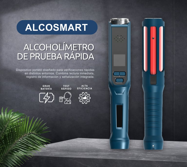 El AlcoSmart es un dispositivo portátil para la detección y cuantificación rápida de alcohol en el aliento humano. Opera mediante un sensor semiconductor, lo que le permite ofrecer mediciones confiables y precisas. Puede funcionar en modo activo (con la cooperación del individuo) o modo pasivo (sin necesidad de soplar directamente), facilitando su uso en diferentes escenarios de control de alcoholemia. Integra memoria para guardar los resultados con fecha y hora, alertas visuales y sonoras ante niveles superiores permitidos, y funciones auxiliares (como luz, linterna u otros accesorios) que lo hacen idóneo para operativos de pruebas rápidas en campo, seguridad empresarial, transporte o vigilancia vial.