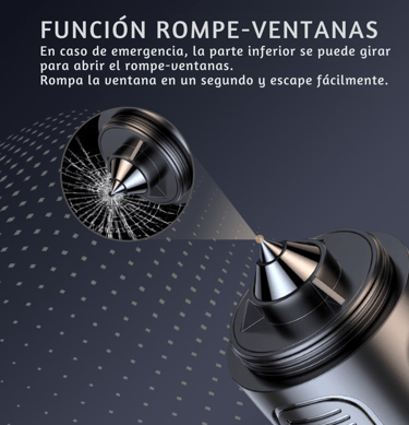 Tiene bastón luminoso, linterna, imán, martillo rompe vidrio y silbato policial