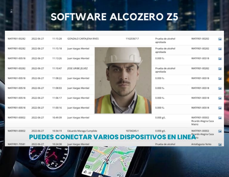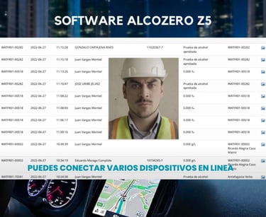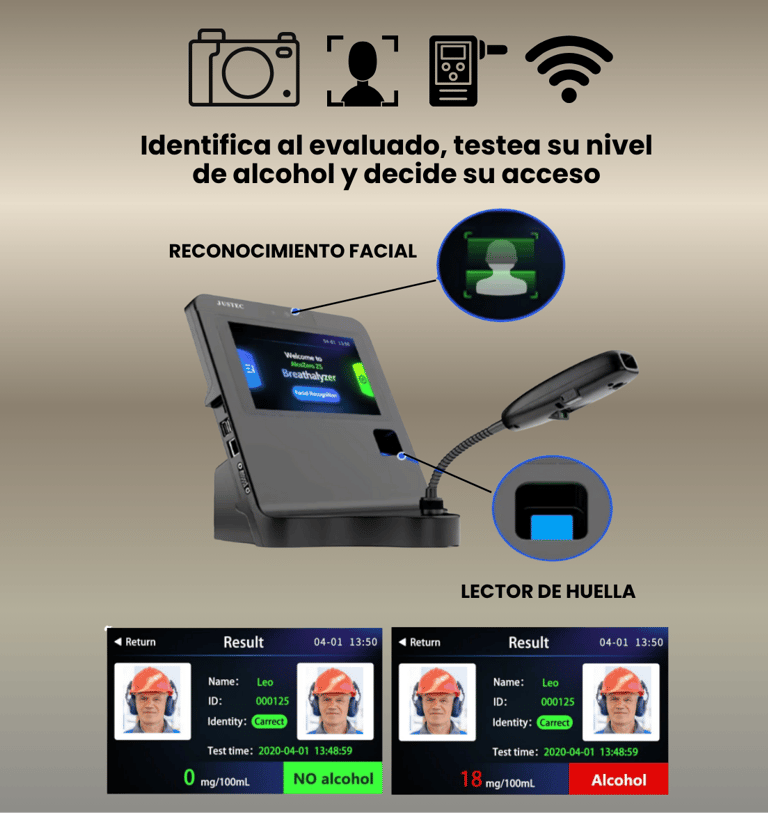 Almacenamiento: 100,000 pruebas visualizables en pantalla del equipo, exportable desde el servidor (incluye nombre del evaluado, ID, resultado, fecha, hora, fotografía del evaluado soplando)