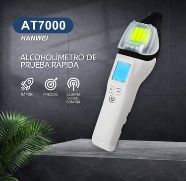 El alcoholímetro Hanwei modelo AT7000 es un equipo portátil de medición diseñado para detectar la presencia de alcohol en el aliento mediante un sensor electroquímico tipo celda de combustible.