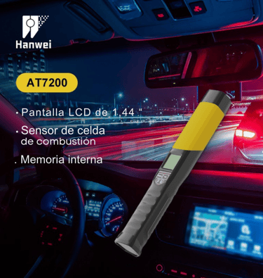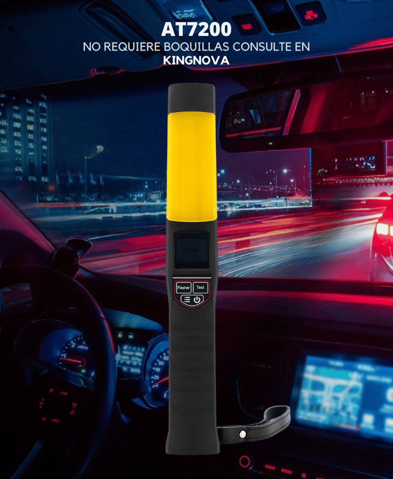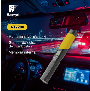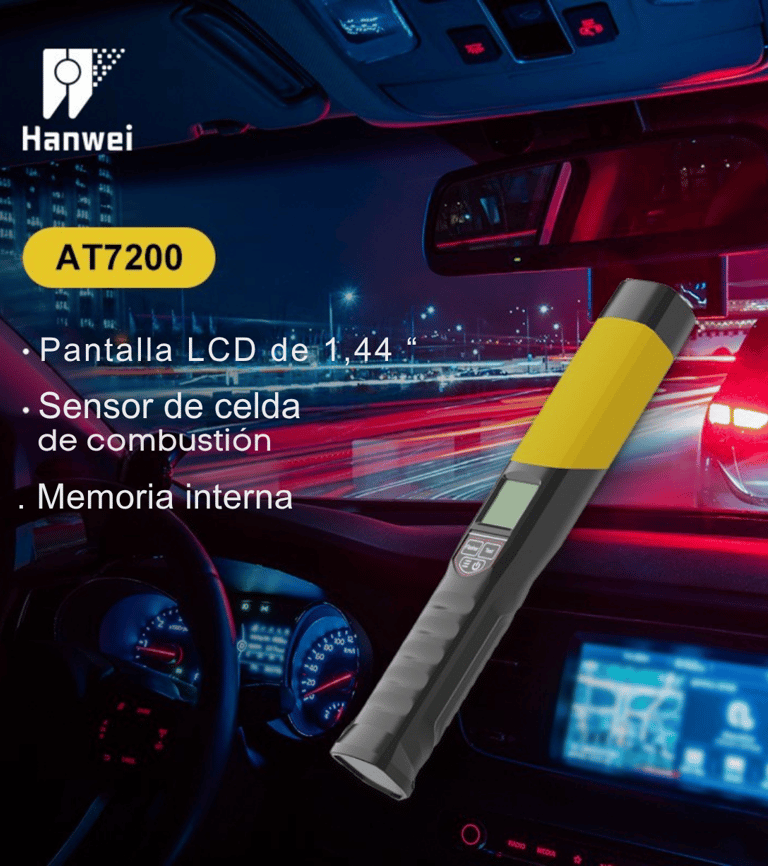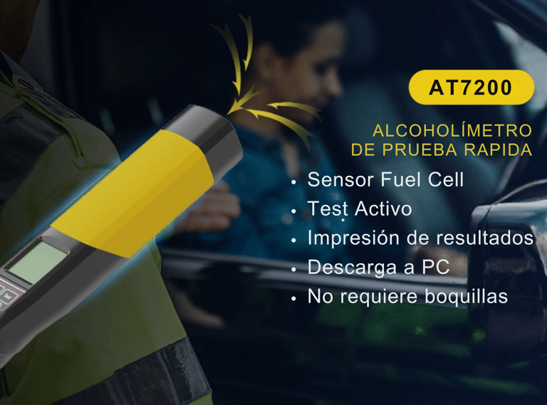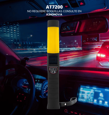 El alcoholímetro AT7200 es un dispositivo portátil diseñado para medir con precisión la concentración de alcohol en el aliento humano. Utiliza tecnología de sensor electroquímico tipo celda de combustible lo que asegura resultados confiables en modo activo o pasivo sin necesidad de boquilla.