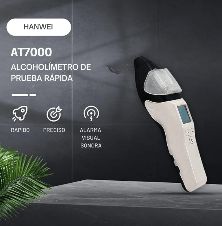 El alcoholímetro Hanwei modelo AT7000 es un equipo portátil de medición diseñado para detectar la presencia de alcohol en el aliento mediante un sensor electroquímico tipo célula de combustible.